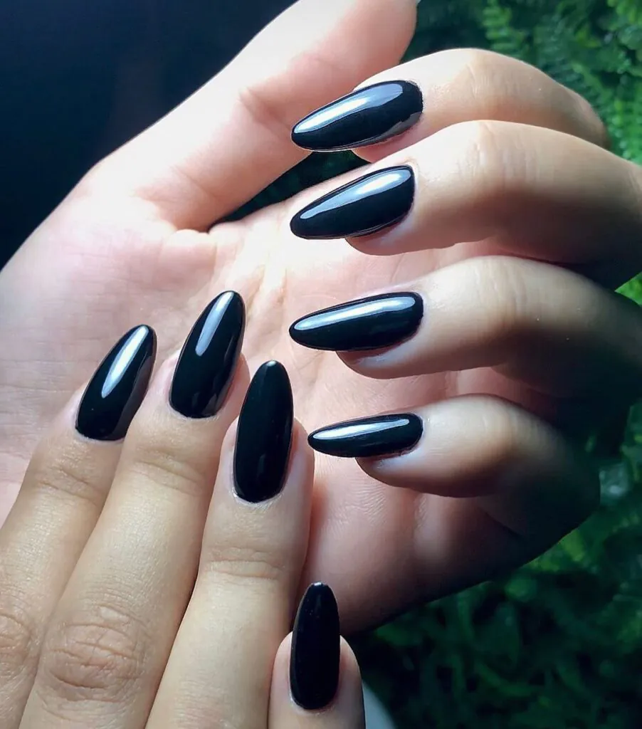 • Unhas com esmalte preto: O esmalte preto é uma escolha clássica para quem busca sofisticação. Com a aplicação da técnica acrigel nas unhas, o resultado é ainda mais impactante, criando um contraste elegante entre o tom escuro e o brilho da extensão.